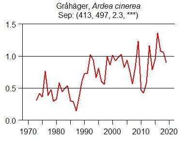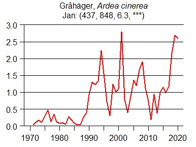 | Hägern förekommer väl spridd på inventeringslokalerna runt södra Sveriges kuster. Vid midvinterinventeringarna har som regel mellan 400 och 1000 hägrar noterats, huvudsakligen runt kusterna, men mindre antal har också setts i inlandet i södra Sverige. Index visar betydande fluktuationer, men båda långtidstrenderna är signifikant ökande liksom korttidstrenden för september. Korttidstrenden för januari är varierade, men antalet övervintrande hägrar beror starkt på hur kalla vintrarna är. En markant nedgång noterades i samband med de kalla vintrarna 2010 och 2011, men sedan dess har hägrarna hämtat sig. Vid de båda täckande kustinventeringarna 2004 och 2015 noterades 495 resp. 606 hägrar runt kusterna. För inlandet saknas täckande inventeringar, men 2015 räknades 190 hägrar på inlandslokalerna. Kartan för januari 2015 visar en spridd utbredning i södra Sverige.