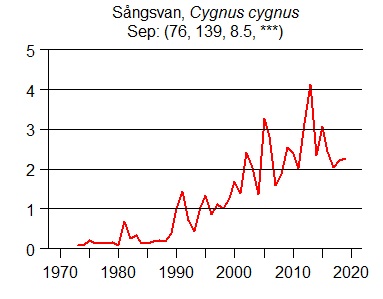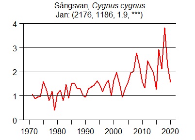 | Tidigare hade sångsvanen en mycket begränsad häckningsutbredning i Sverige, där den var koncentrerad till den nordligaste delen av landet. Under senare decennier har arten ökat i antal explosionsartat och häckar nu i hela landet och är mångdubbelt vanligare. På hösten anländer betydande antal sångsvanar från häckningsområdena i Finland och Ryssland. En betydande del av dessa torde stanna kvar i landet under vintern. Arten kan finnas vintertid på öppet vatten i hela landet, men är koncentrerad till den sydligaste delen. Mikdvinterindex för sångsvanen visar också en ökning genom åren, men denna motsvarar inte på något sätt den verkliga ökningen av det häckande beståndet. Detta förklaras av att sångsvanarna markant ändrat sina vanor under senare år och numera tillbringar en stor del av sångsvanarna hela dagen med födosök på åkrar och fält, vilka normalt inte täcks in vid sjöfågelinventeringarna. Januari 2008 visade emellertid ett mycket högre index än alla tidigare år. För att bättre täcka in sångsvanbeståndet i landet och i övriga Europa organiserades en speciell sångsvaninventering i samband med midvinterinventeringen 1995 i Sverige och i övriga Europa. Beståndet i Sverige uppskattades vid detta tillfälle till åtminstone 8000 individ, vilket skall jämföras med ca 2000 övervintrande sångsvanar vid de landsomfattande andfågelinventeringarna i början av 1970-talet. Ytterligare landsomfattande sångsvaninventeringar organiserades i januari 2000 och 2005. I januari 2000 beräknades antalet åter till ca 8000, medan nästan 9000 sångsvanar räknades in i Sverige i januari 2005, och beståndet torde då ha legat mellan 9000 och 10000 sångsvanar. Den senaste sångsvaninventeringen i denna serie genomfördes under Januari 2020, se länken nedan.